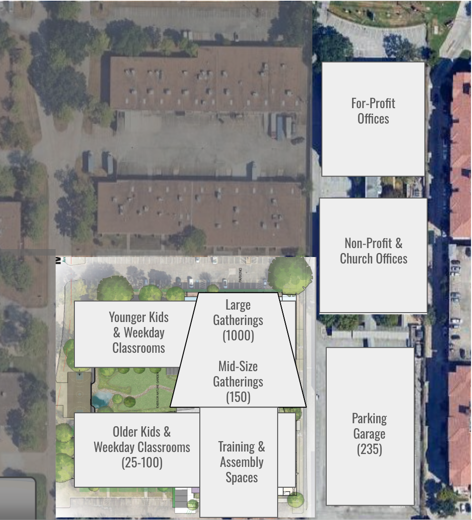 This property is 4.05 acres with 63,000 sq ft of interior space, which would include a 1,000-seat multi-use auditorium, mid-size convening spaces, kids and classrooms.